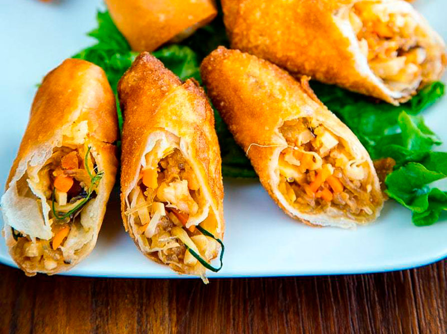 9. Fríe los rollitos introduciéndolos unos minutos en aceite caliente. Una vez adquieran color dorado sácalos.